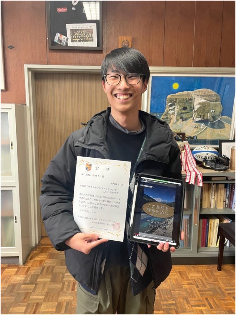 12月13日(土)に長野県主催のゼロカーボン動画コンテスト表彰式が行われ、本校の森川瑛斗さんがAC長野パルセイロ賞を受賞しました。以下は森川さんのコメントです。