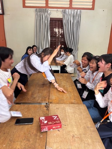 ④Hun Sen Wat Svay高校では校内を見学した後、伊那北高校や伊那北生について英語で発表、そしてAチームはなんじゃもんじゃ、Bチームは坊主めくりで盛り上がりました。短時間でしたが、同じ高校生どうしあっという間に打ち解けて仲良くなっていました。
